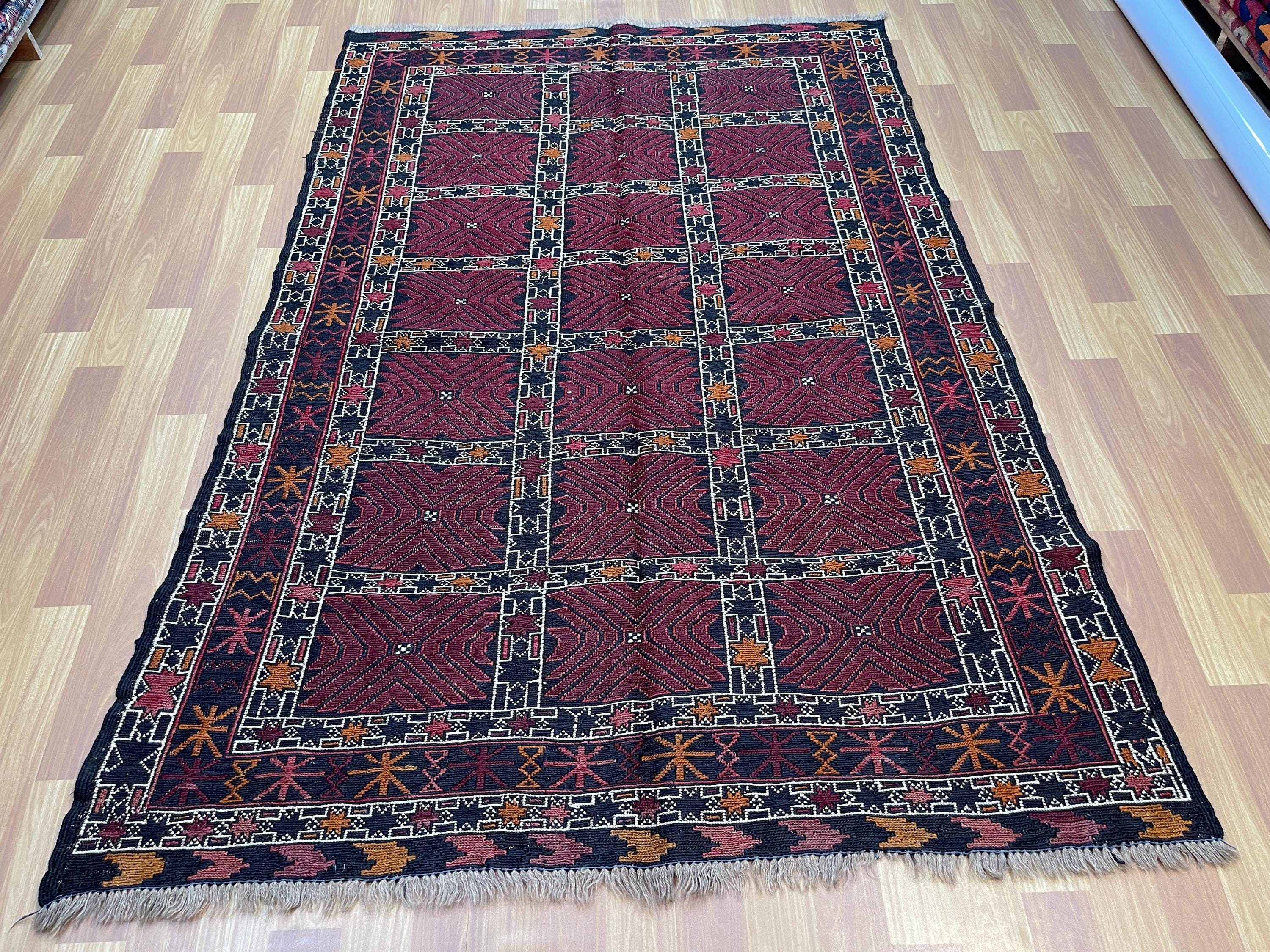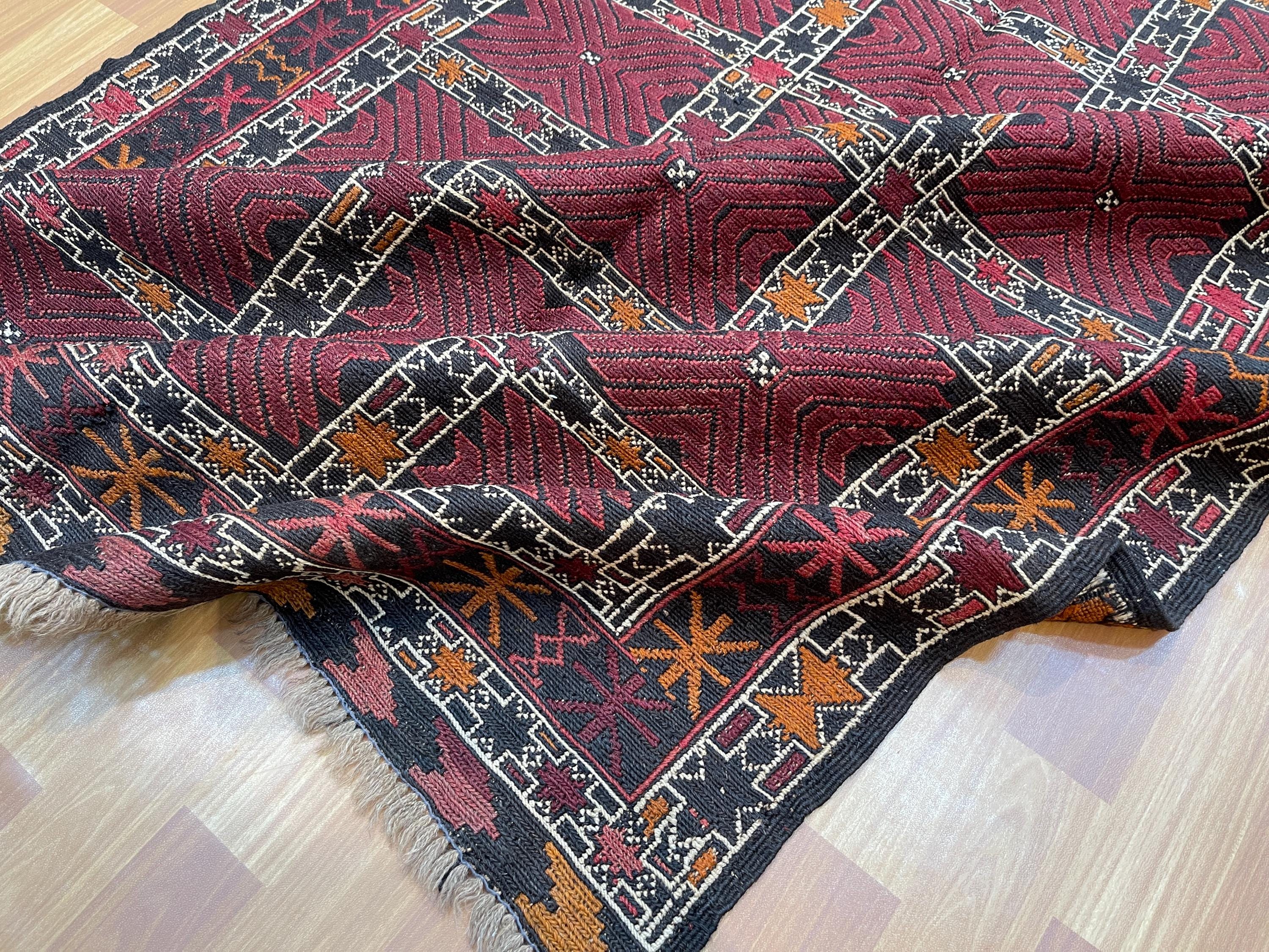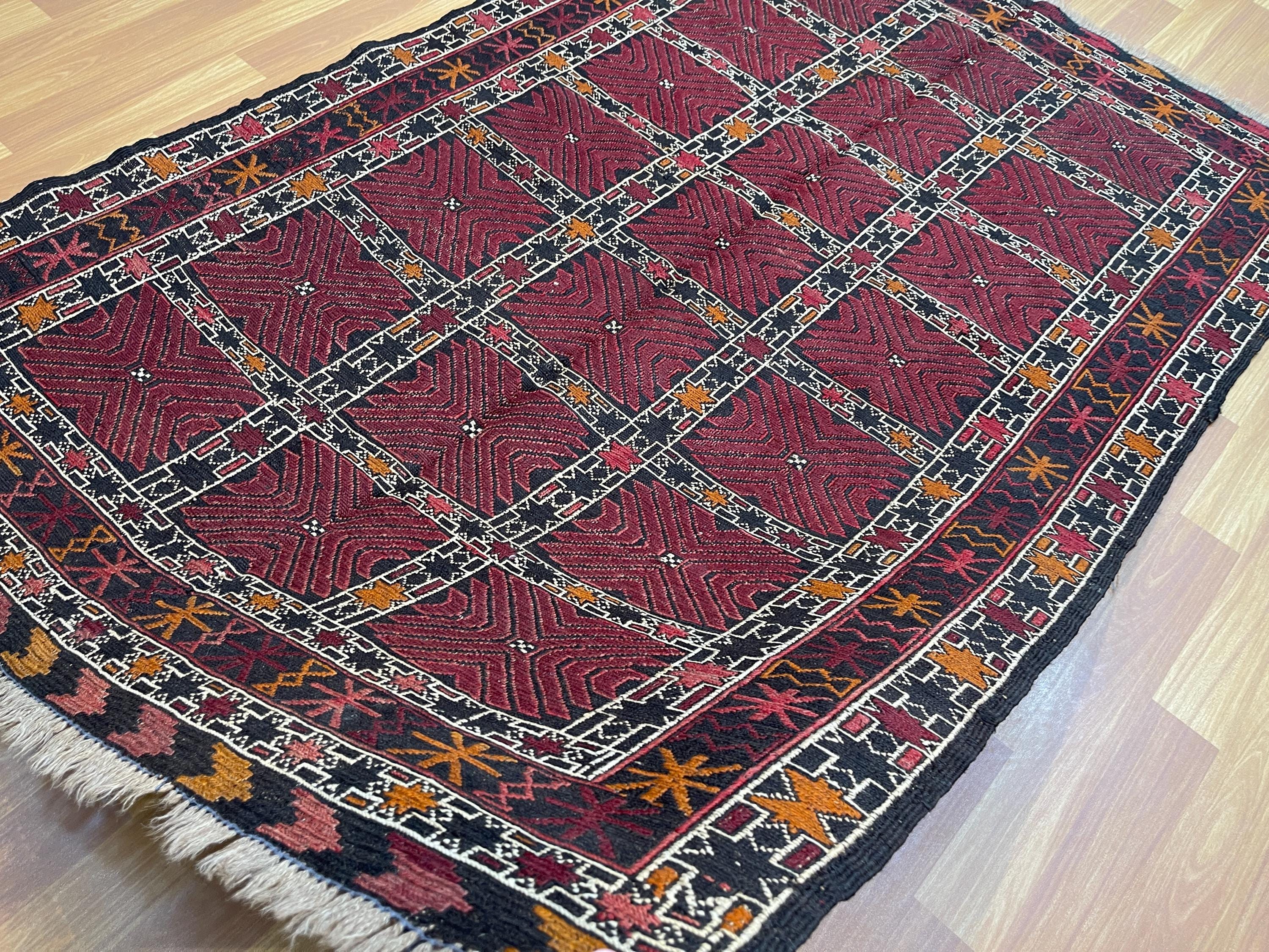 4x6 ft Red Soumak Afghan Kilim Rug - Fine Turkmen Traditional Handmade Rug 4x6.3 ft - Geometric Caucasian Wool Rug - Turkish Kilim Area Rug