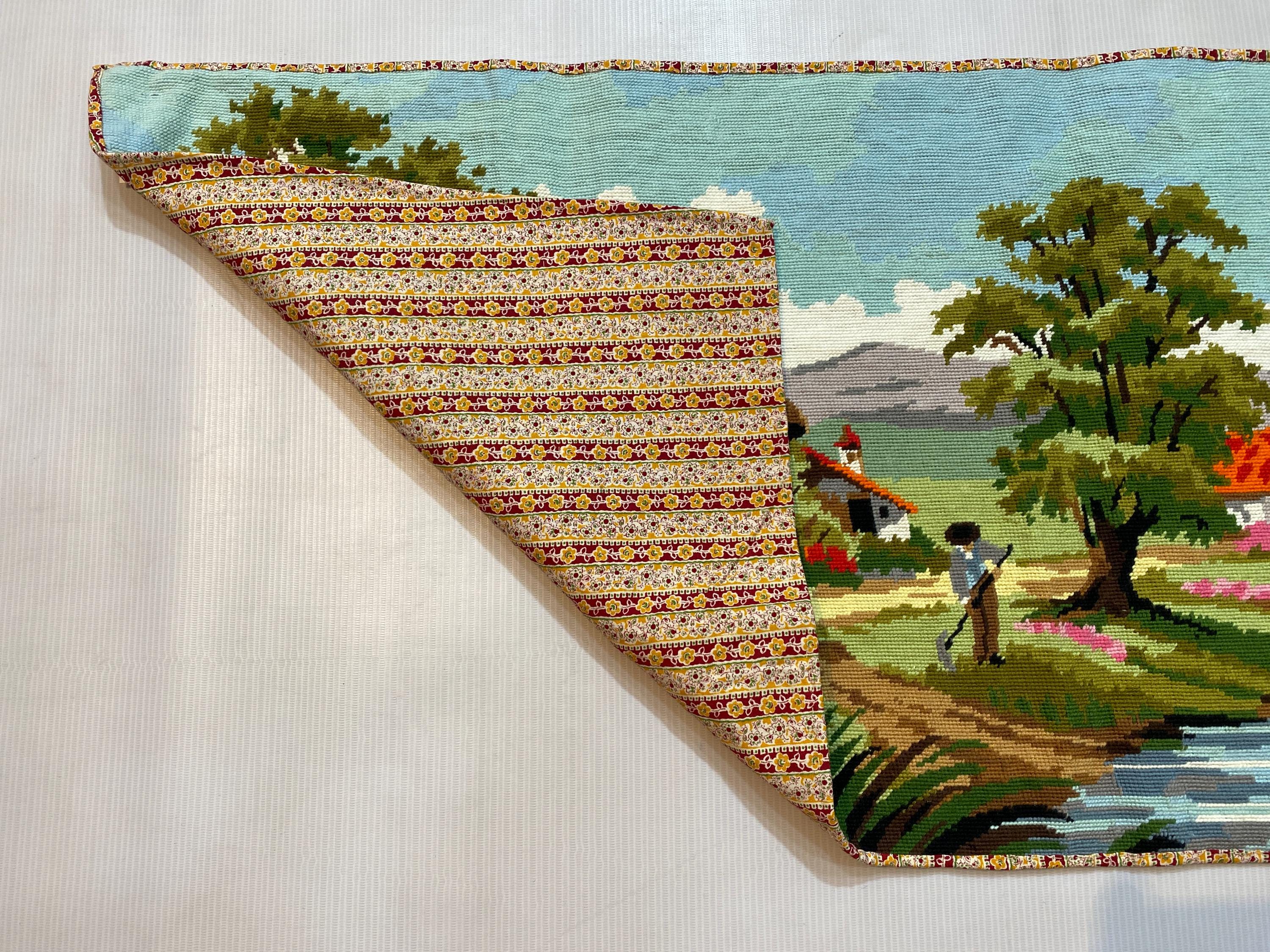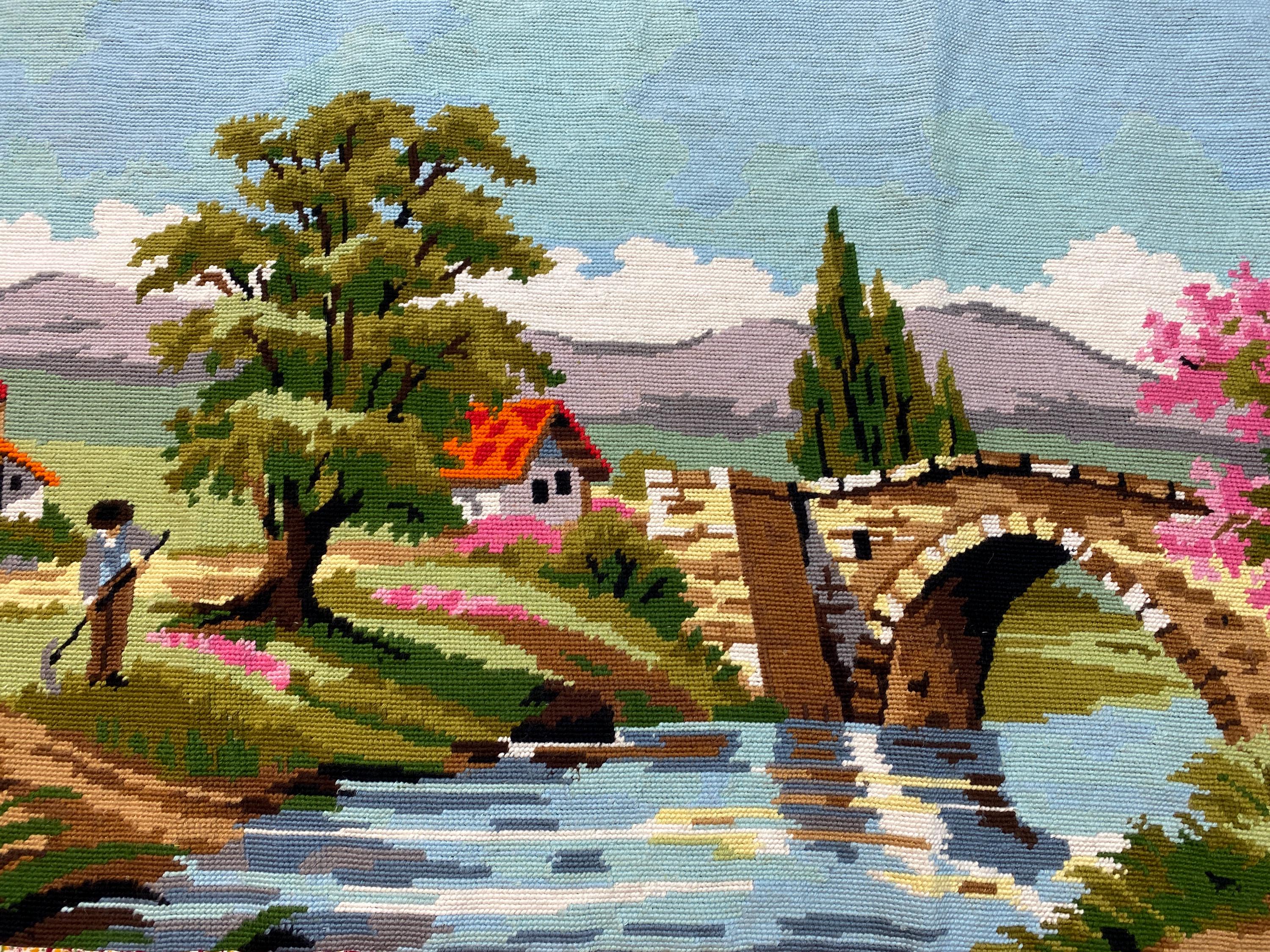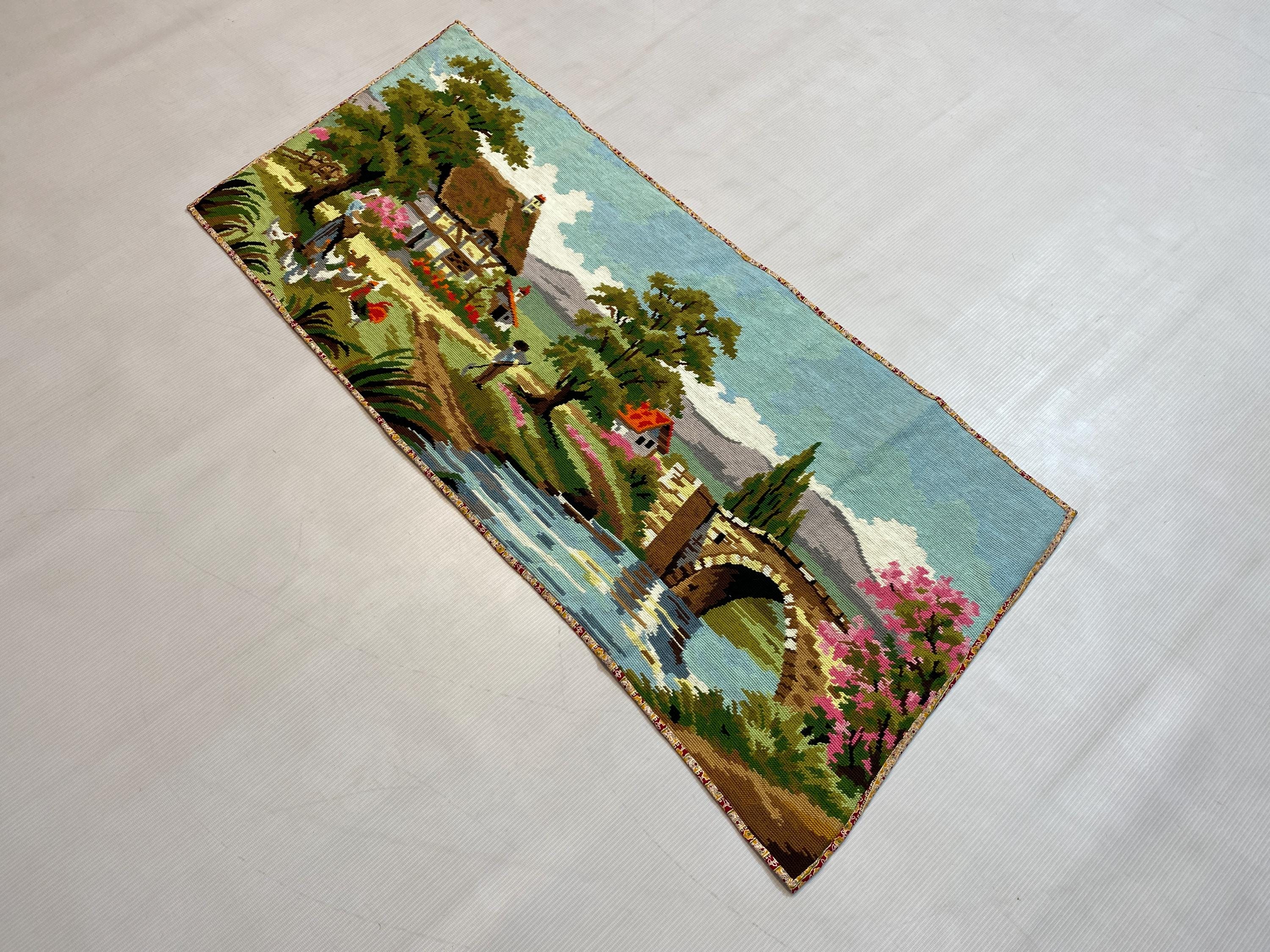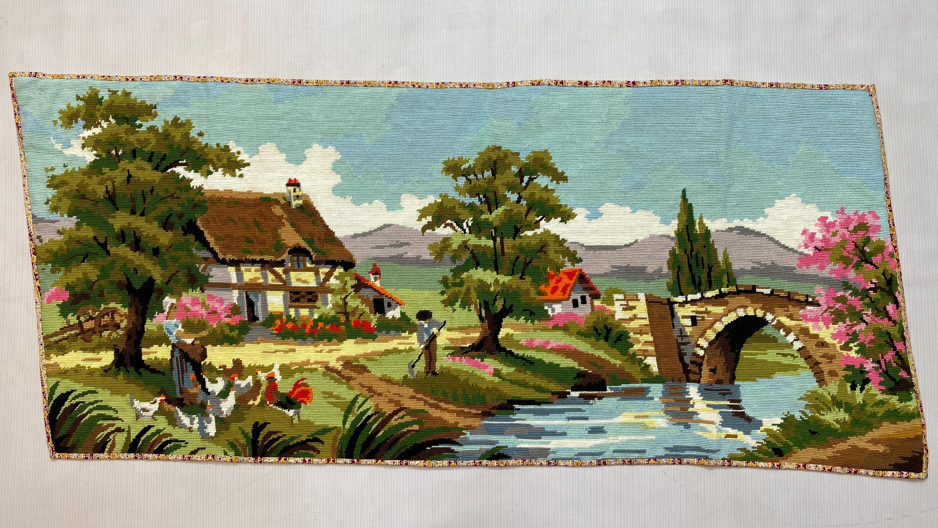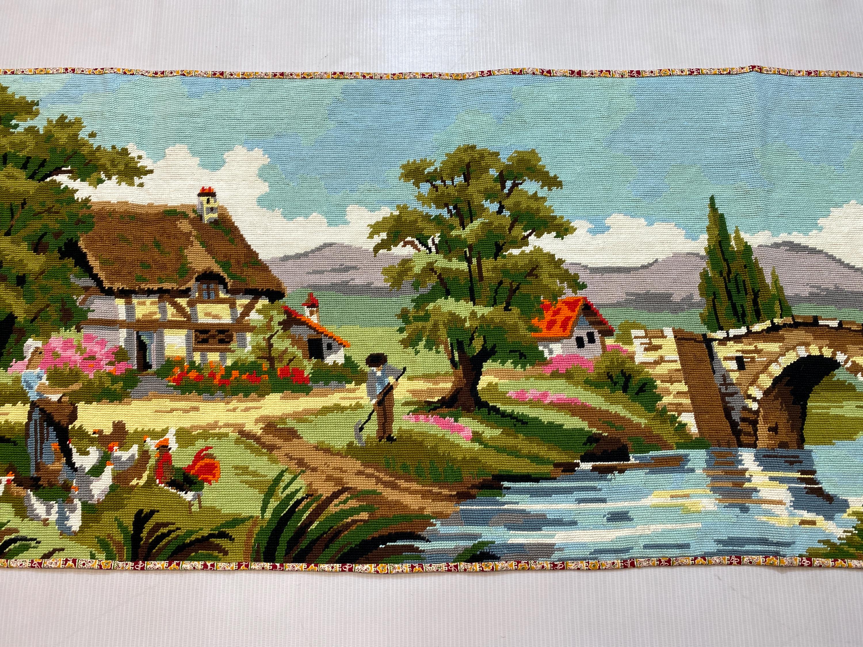 4x2 Antique 1950s French Pictorial Portrait Tapestry Wall Decor Art - Village Farmer Hens Mountains Trees River Bridge Wall Hanging 3.7x1.7