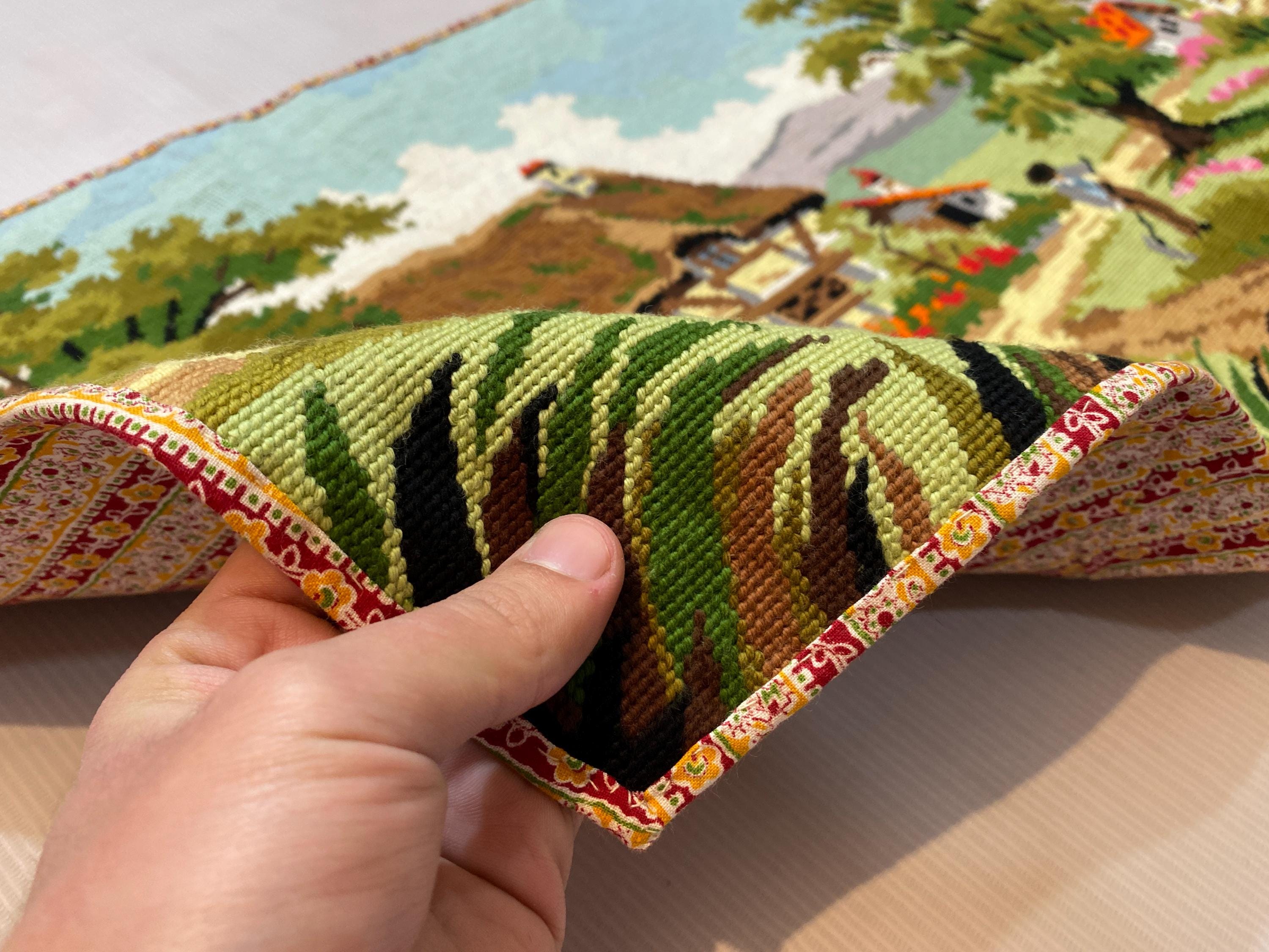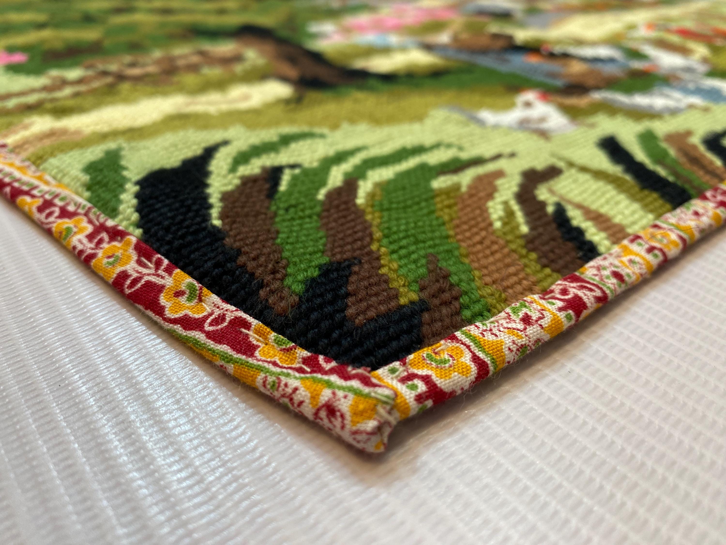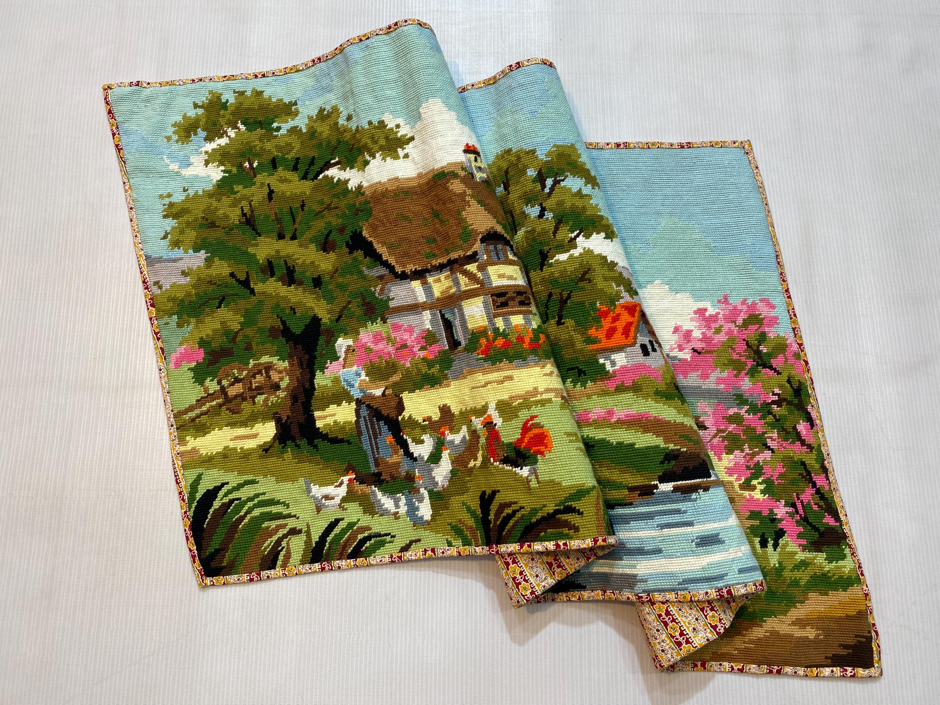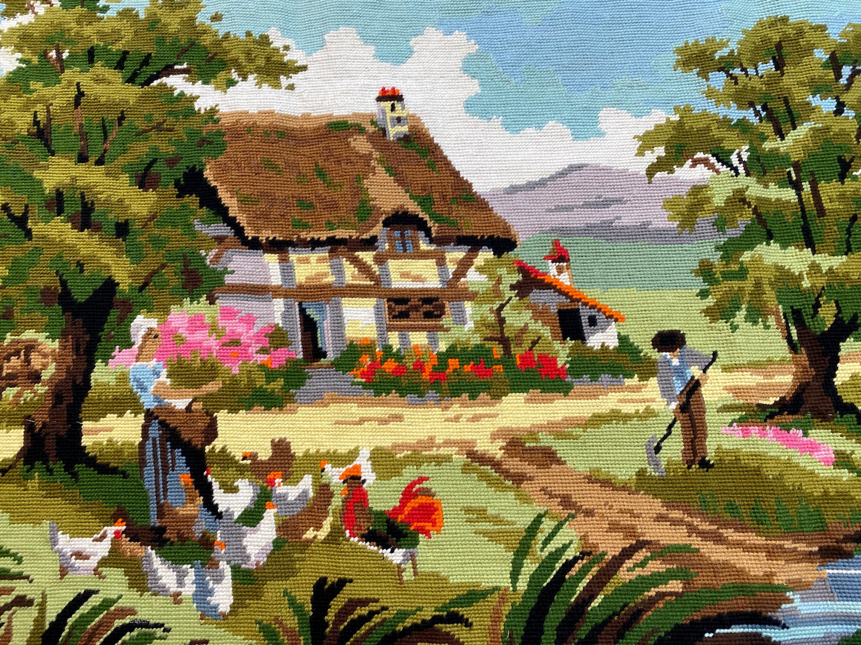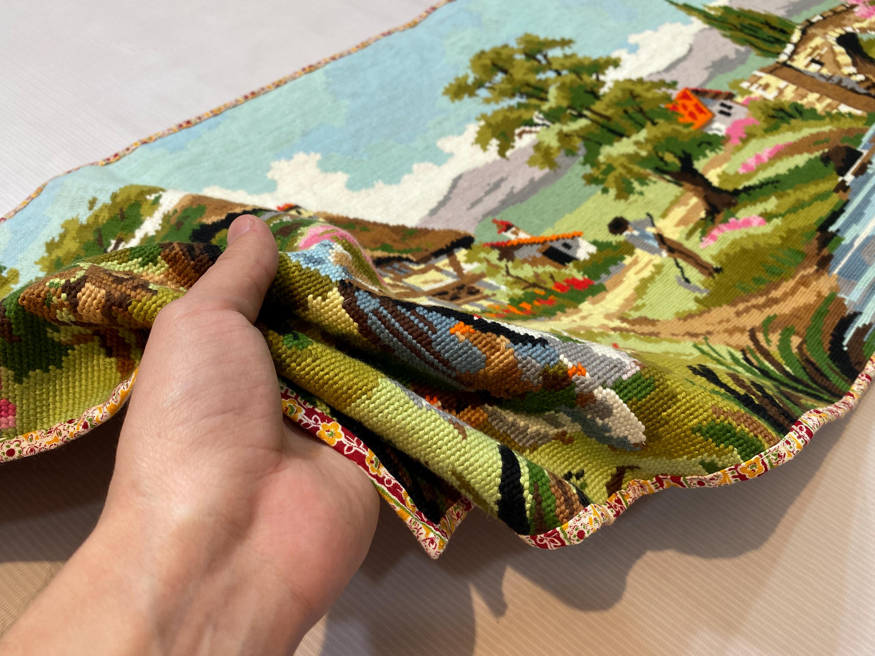 4x2 Antique 1950s French Pictorial Portrait Tapestry Wall Decor Art - Village Farmer Hens Mountains Trees River Bridge Wall Hanging 3.7x1.7