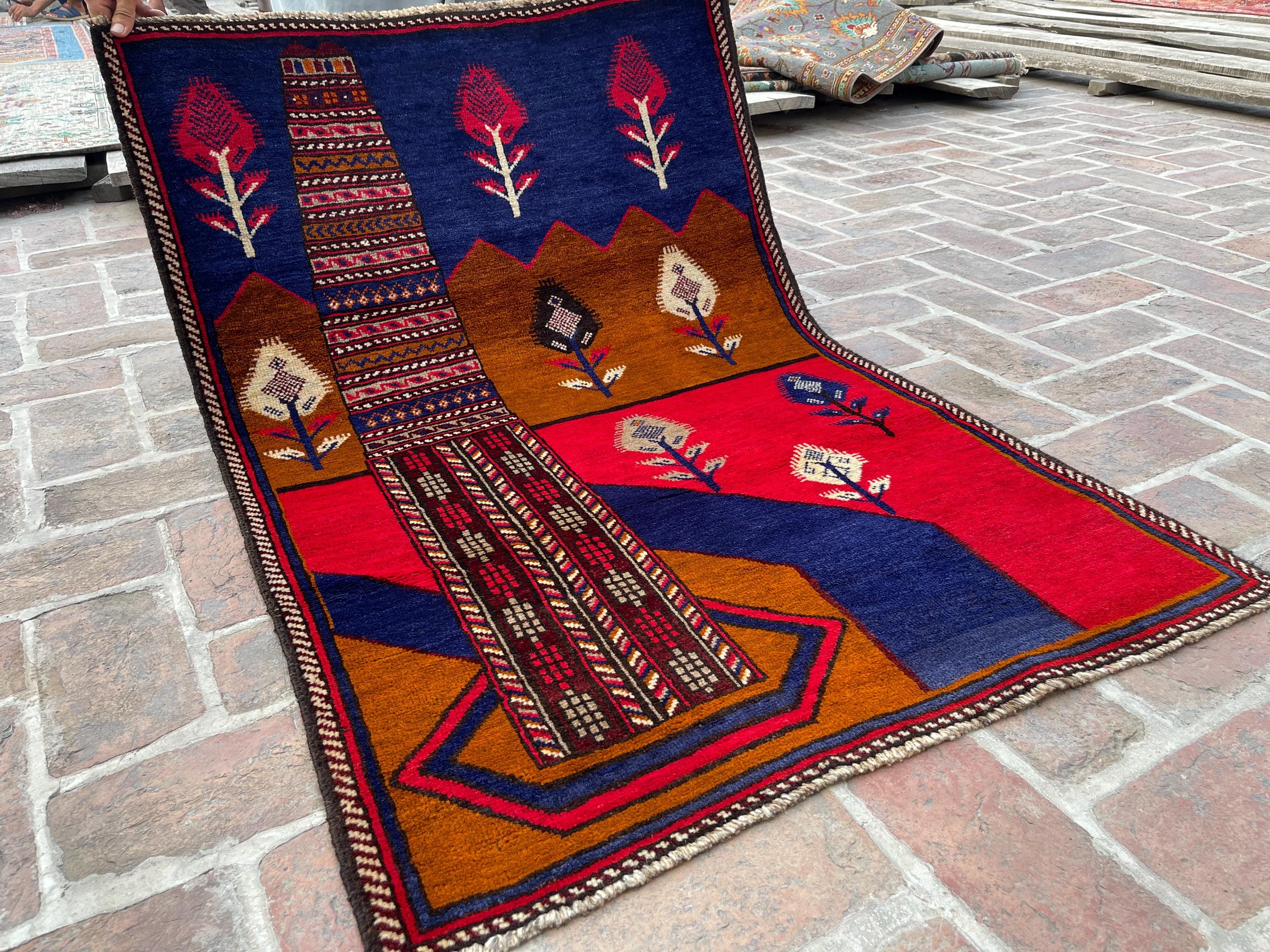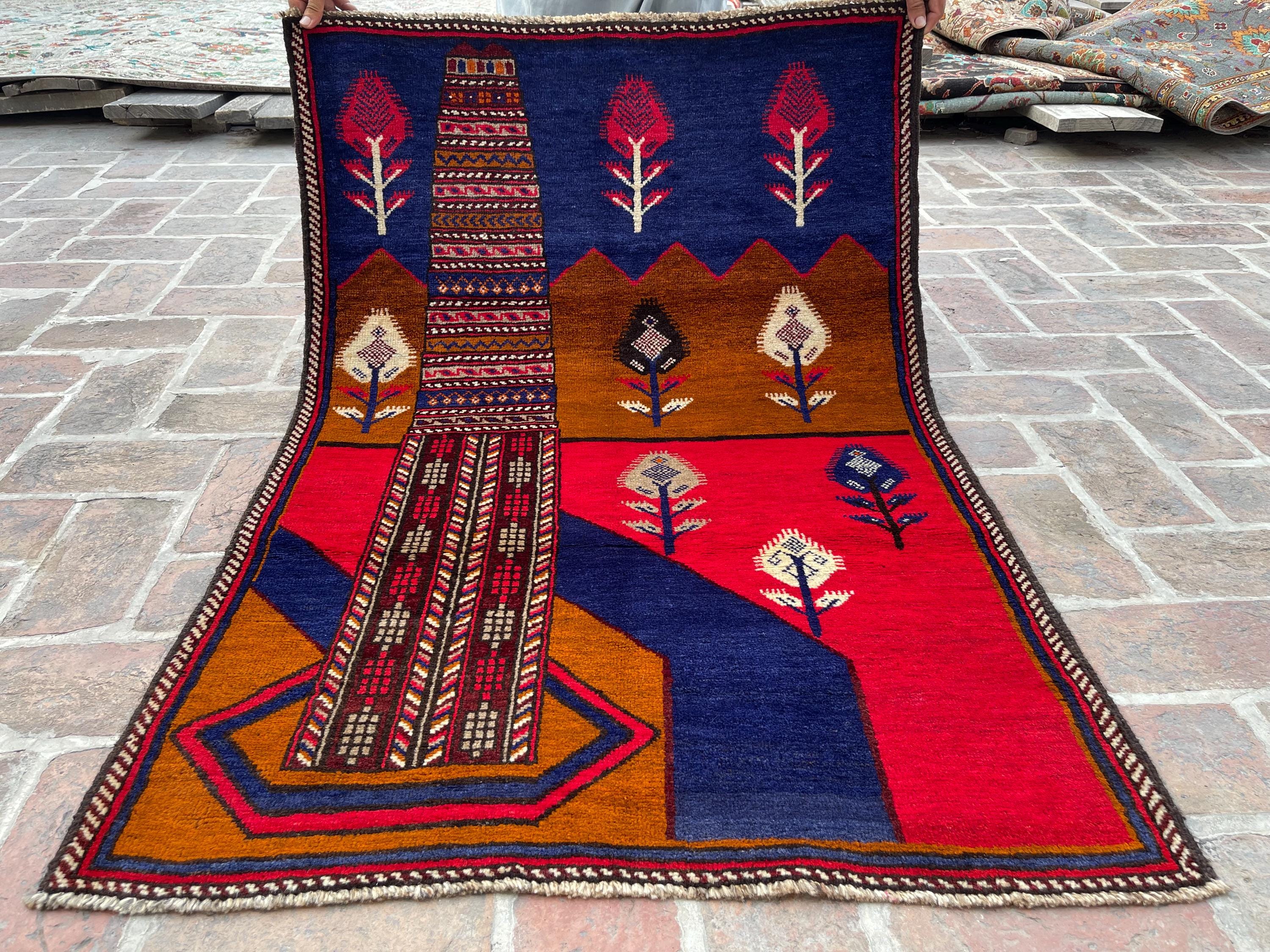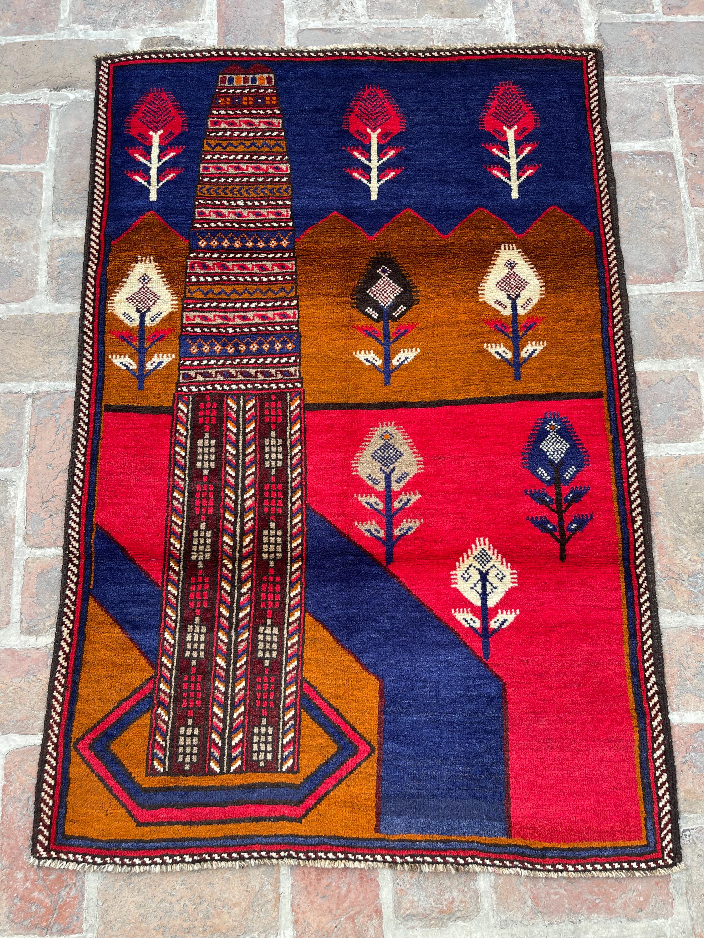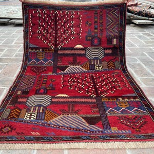 FREE SHIPPING 3x5 Red Blue Pictorial Baluch Rug - Scenery Scene Trees River Tribal Nomadic Oriental Rug - Wall Hanging Accent Carpet 3x4'5