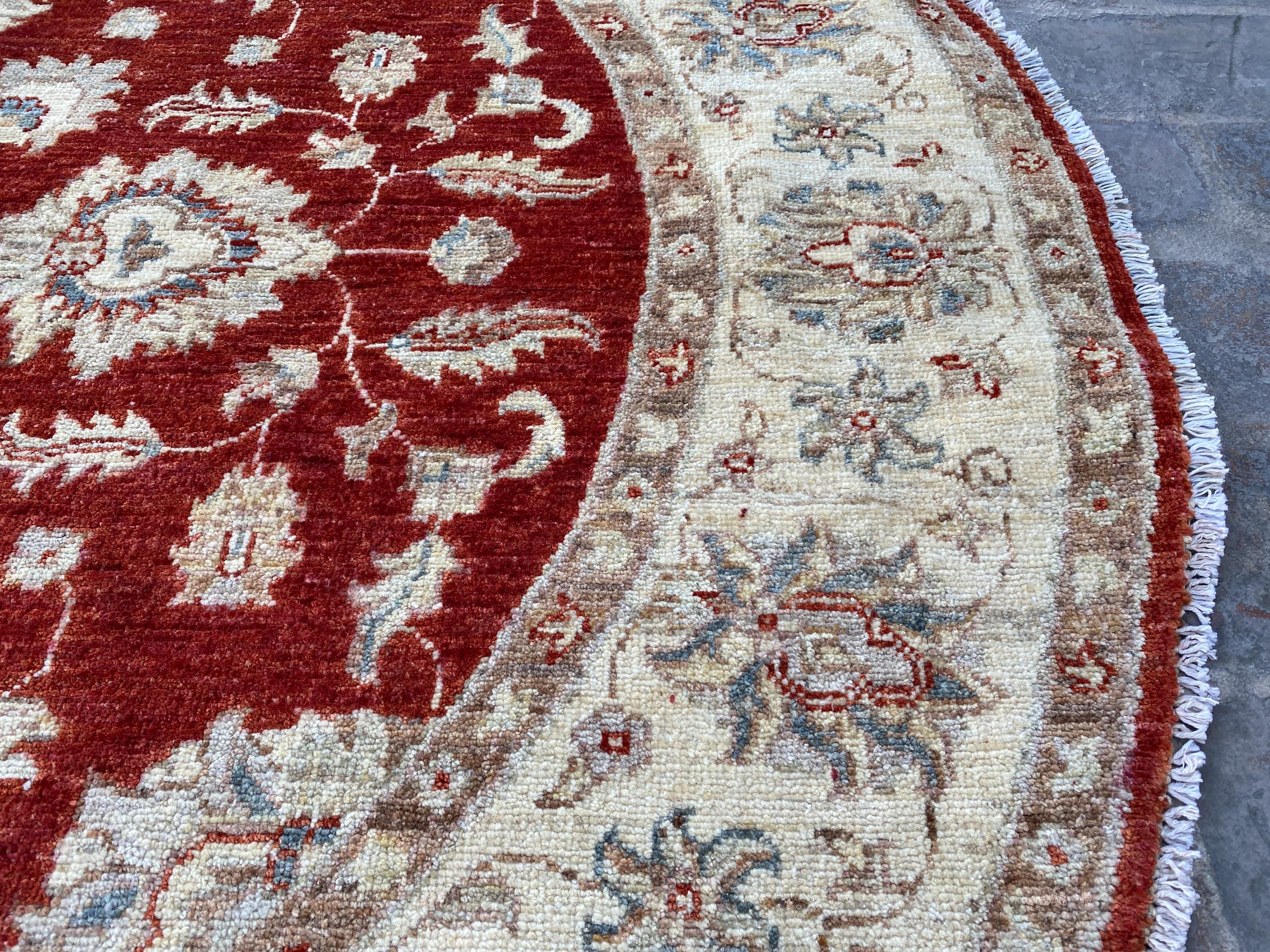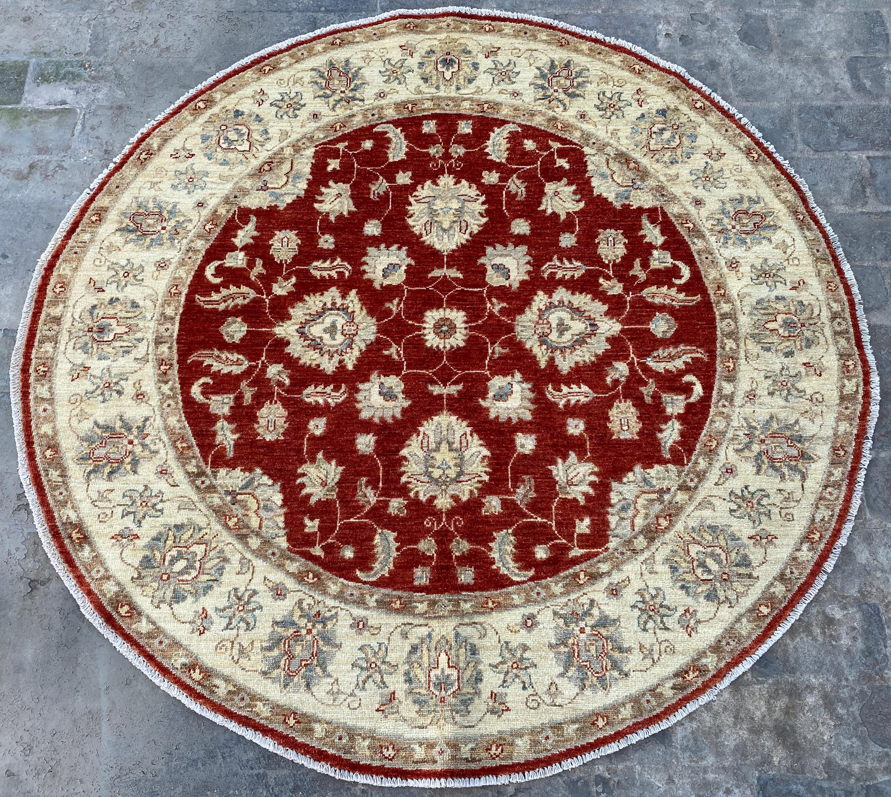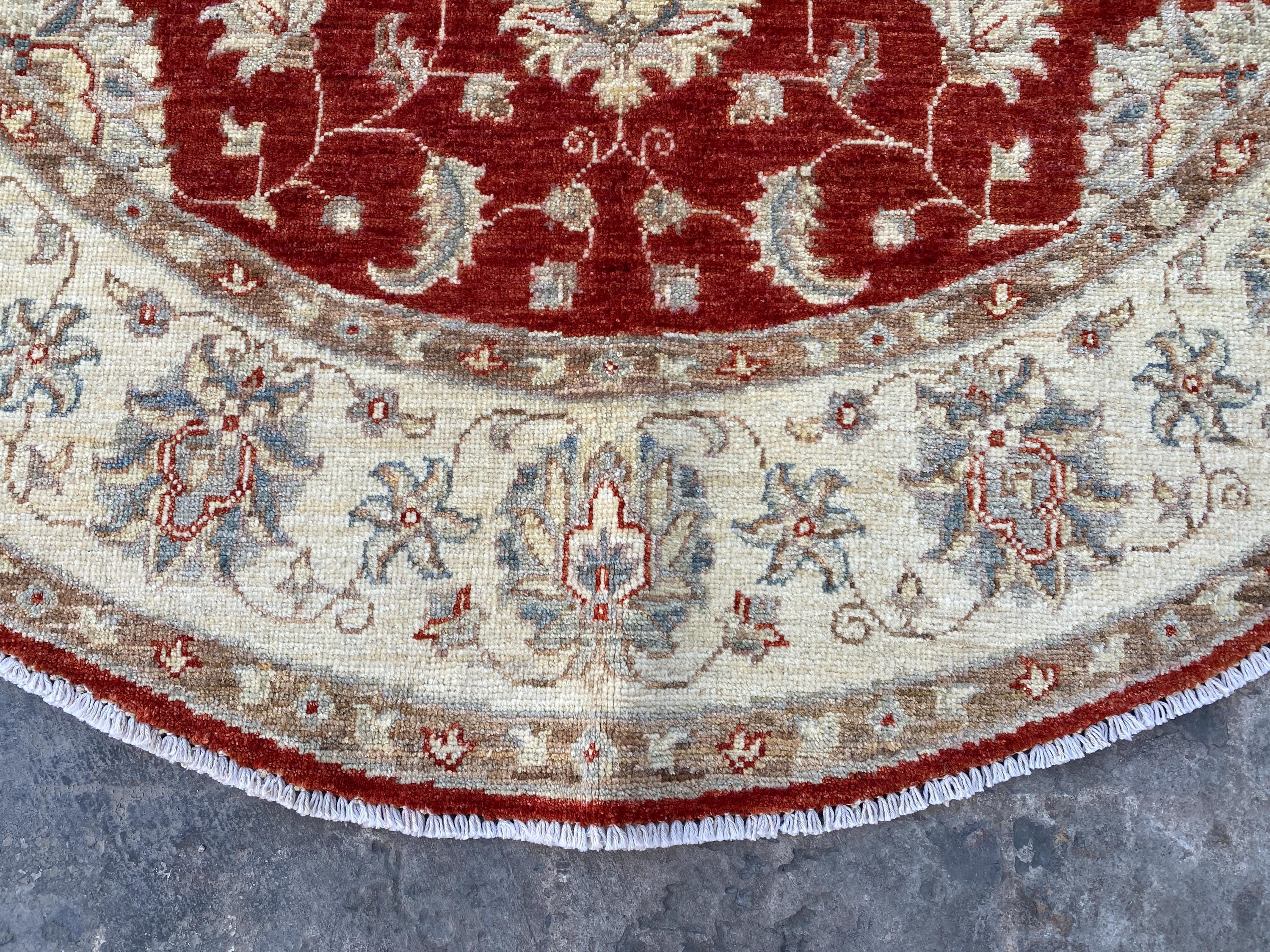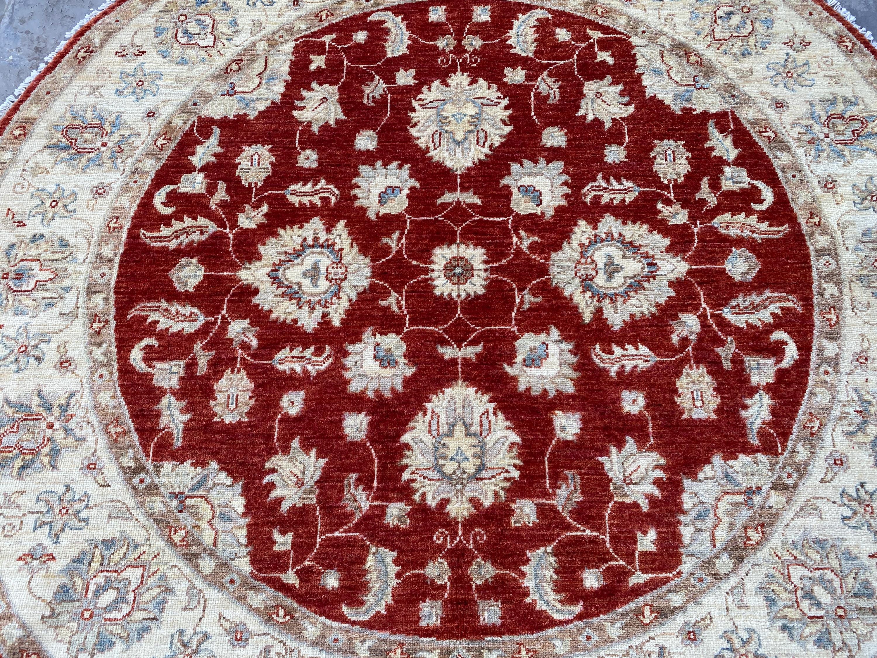 5x5 Red Beige Durable Chobi Turkmen Handspun Wool Ziegler Rug - Hand Knotted Turkish Oushak Round Rug - Afghan Geometric Floral Area Carpet