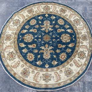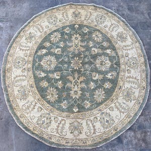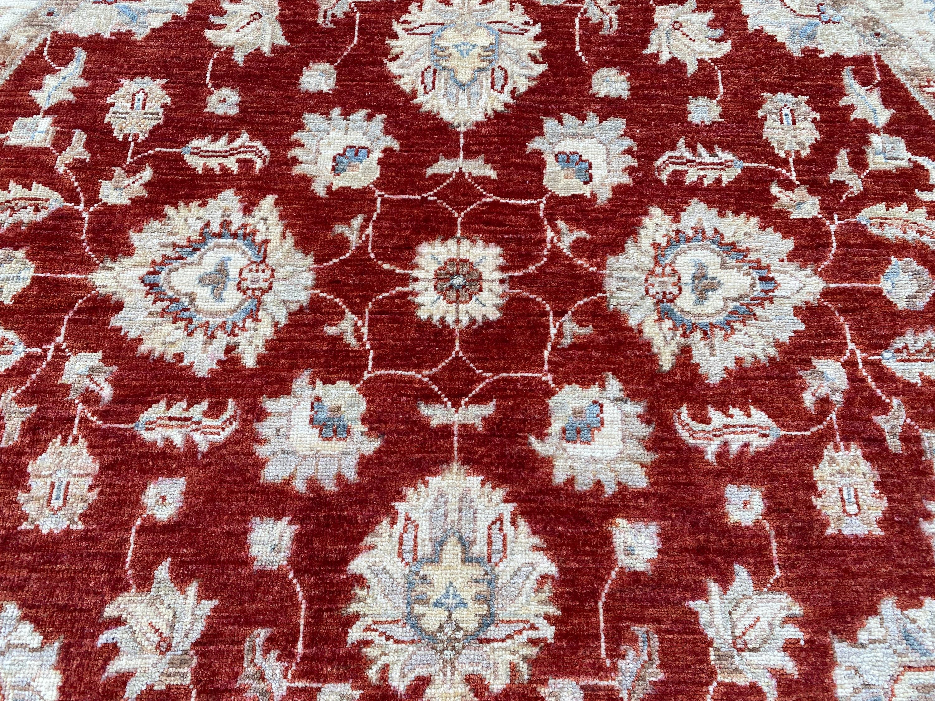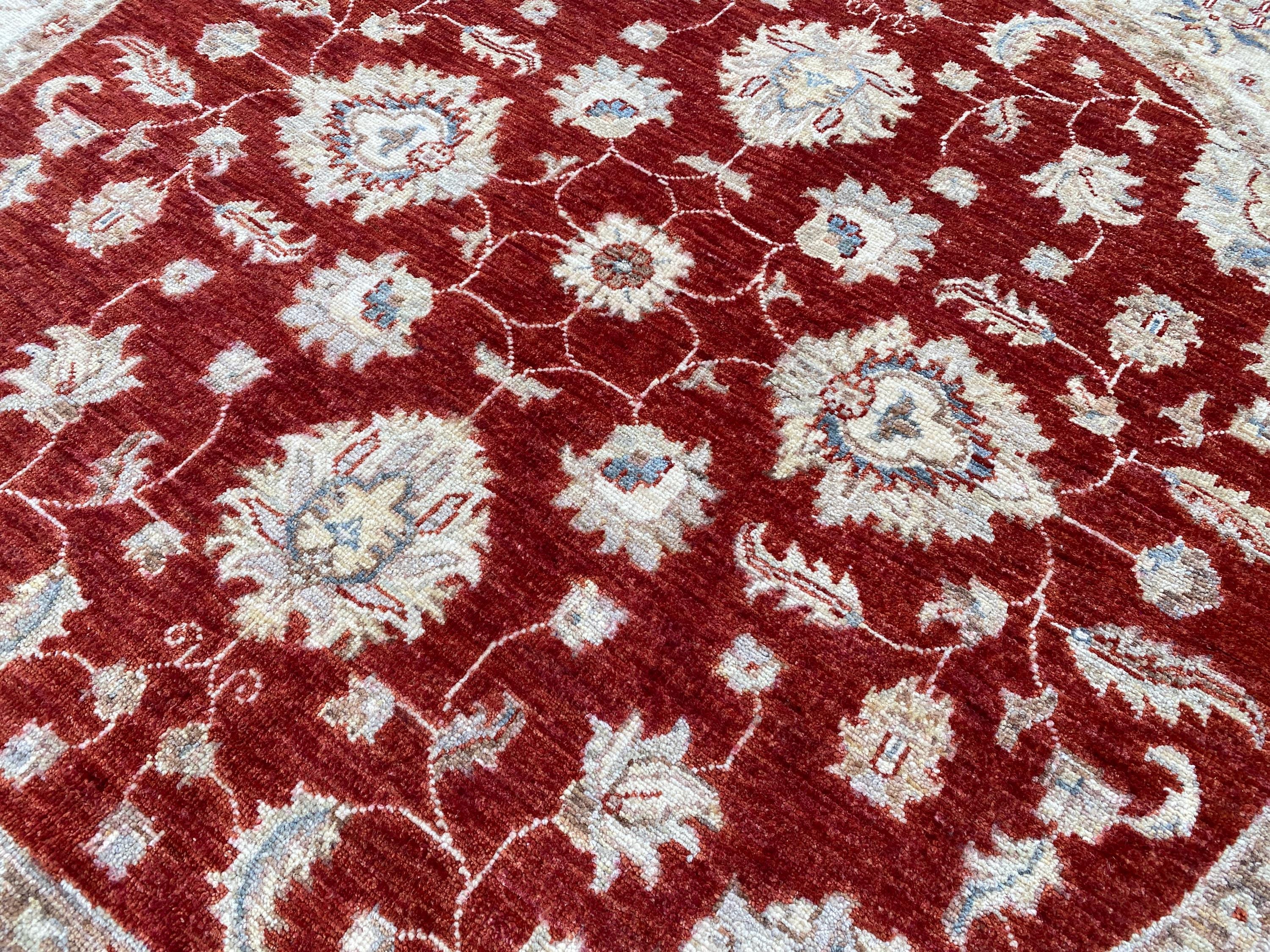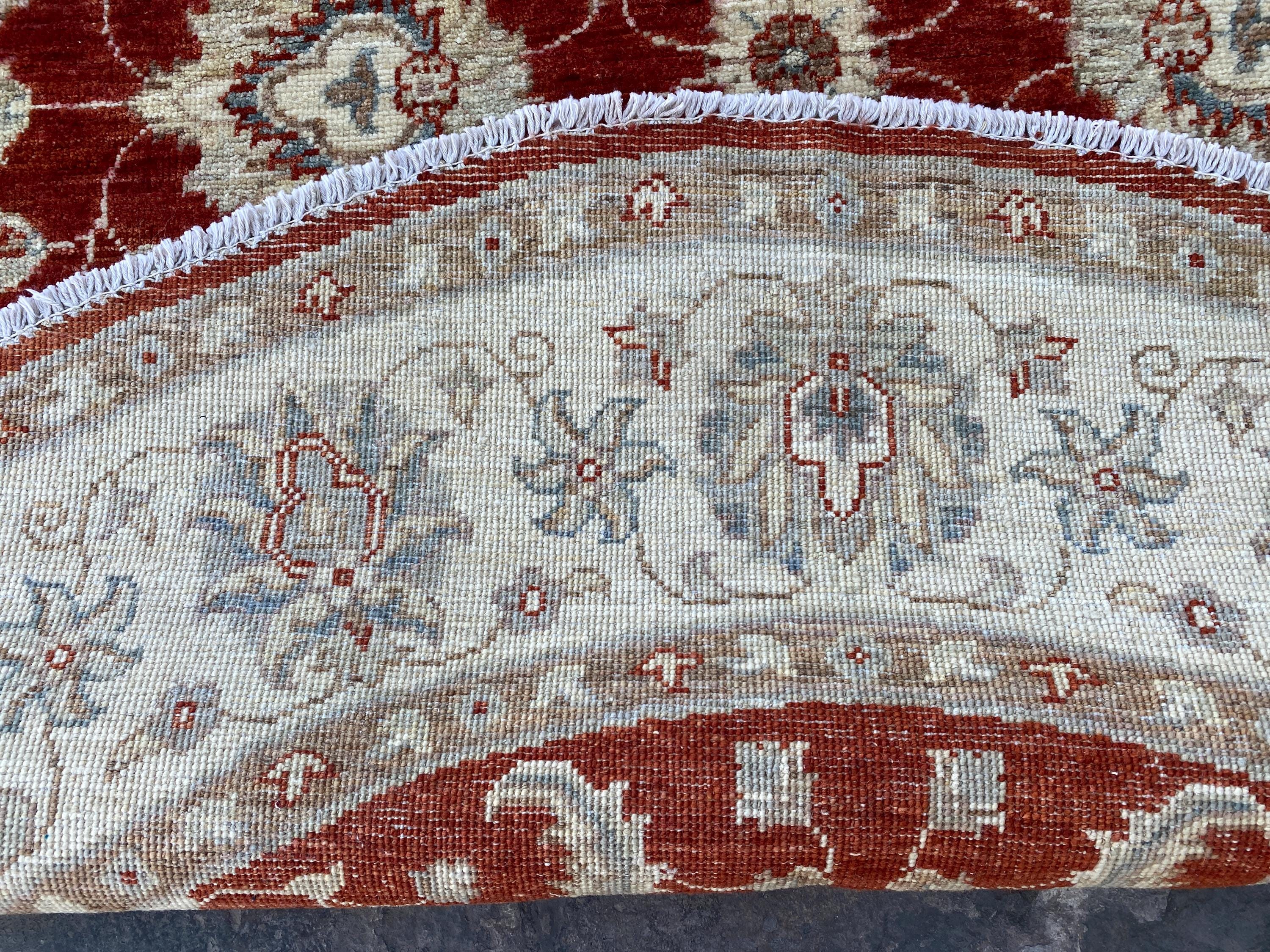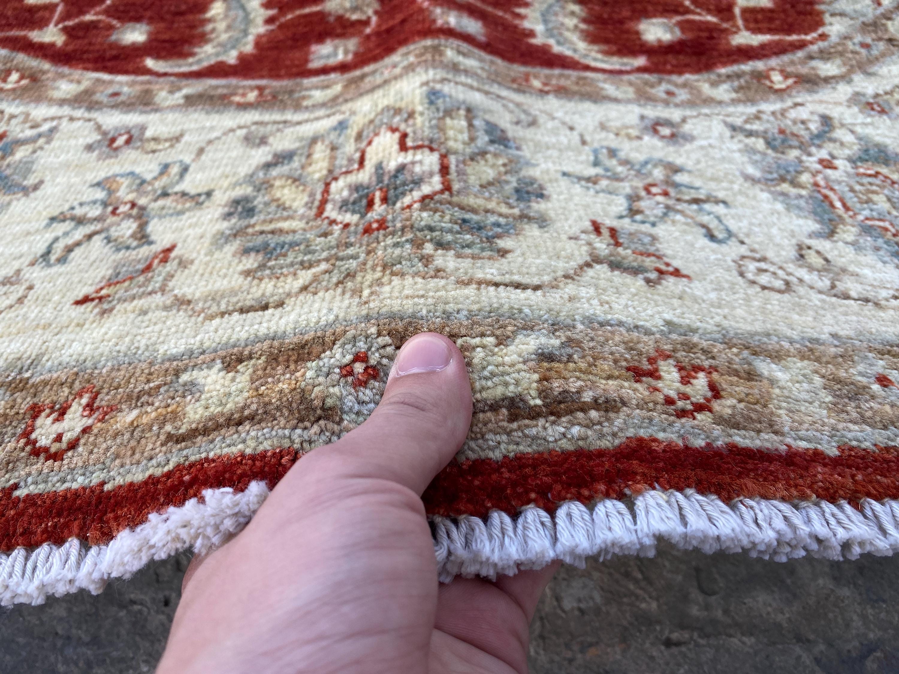 5x5 Red Beige Durable Chobi Turkmen Handspun Wool Ziegler Rug - Hand Knotted Turkish Oushak Round Rug - Afghan Geometric Floral Area Carpet
